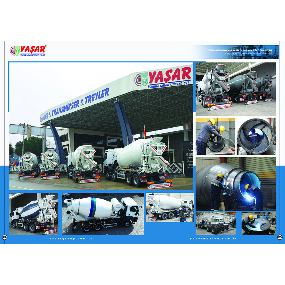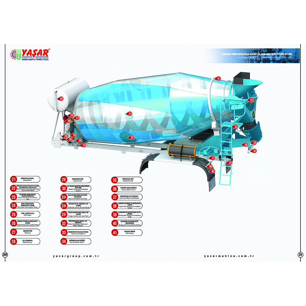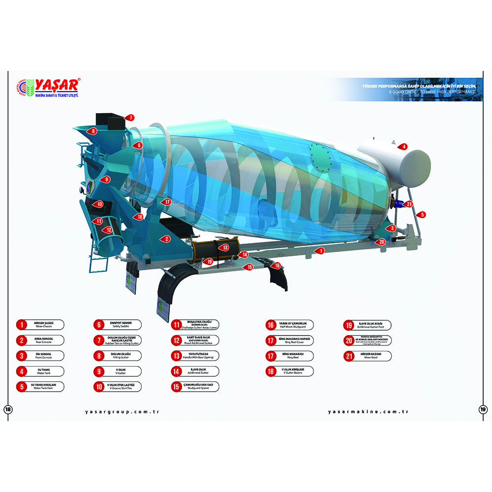 Складная дополнительная овальная конструкция желоба обеспечивает поток бетона, не позволяя ему засоряться. Система подъема вращающегося желоба представляет собой гидравлическую подъемную систему с гидравлическим домкратом. Лестничная система позволяет безопасно видеть бетон. Она также используется для промывки загрузочных и разгрузочных желобов смесителя. Автобетоносмеситель предназначен для приготовления бетонной смеси. Внутри него находится барабан или смеситель, и этот барабан вращается. Материалы бетона (цемент, песок, гравий, вода) смешиваются в барабане, и создается однородная бетонная смесь. Автобетоносмесители могут быть доступны в различных объемах. Существуют модели разных размеров от небольших смесителей для небольших строительных проектов до смесителей большой емкости для крупных строительных проектов. Автобетоносмеситель, Миксер, Автобетоносмеситель