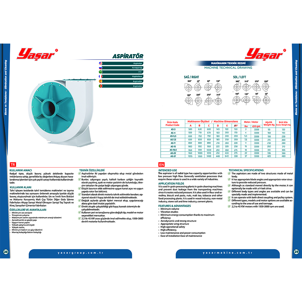 The aspirator is of radial type has capacity opportunities with low pressure high flow. Generally ventilation processes that require these values is used in a wide variety of industries. It is used in grain processing plants in grain cleaning machines and prevent dust leakage from the transporting machines since it creates reduced pressure. It is also used in flour and semolina, biscuit and pasta, nuts, malt tea, tobacco and other food processing plants. It is used in wood industry, non-metal industry, stone soil and lime industry, cement plants. Minimum energy consumption thanks to maximum efficiency. Aerodynamic and strong structure. Appropriate wing structure.High operational safety. Rice processing machines