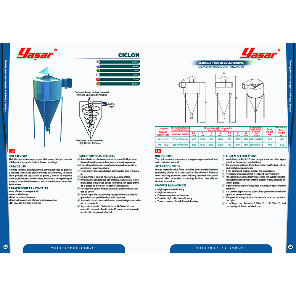 El centro ciclónico utiliza la energía de escape para separar el aire y los materiales sólidos en el aire. Se utiliza en plantas procesadoras de arroz, harina, sémola y otros alimentos. También se utiliza en la industria química, la industria maderera, la industria de la piedra y la tierra, la industria del cemento y otras instalaciones de procesamiento industriales que dependen de la separación de polvo y aire. Además del diseño de acero St-37, existen otros tipos adecuados para aplicaciones de servicio pesado. Los ciclones optimizan sus dimensiones en base a mediciones experimentales. Tiene un tamaño de módulo optimizado para la instalación. El tiempo de instalación necesario se reduce al mínimo. Para uso especial con materiales abrasivos, el separador ciclónico se refuerza con acero cromado o placas altamente resistentes a la abrasión. La alta concentración de polvo no afecta el funcionamiento de la máquina. Maquinaria de molino de arroz