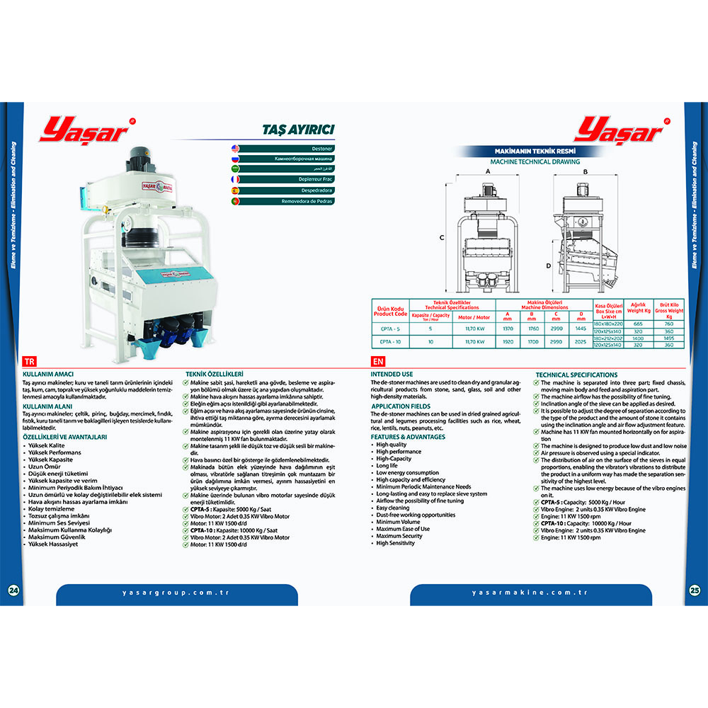 Les machines à épierrer sont utilisées pour nettoyer les produits agricoles secs et granulaires de la pierre, du sable, du verre, de la terre et d'autres matériaux à haute densité. Les machines à épierrer peuvent être utilisées dans les installations de traitement des céréales et des légumineuses séchées telles que le riz, le blé, le riz, les lentilles, les noix, les arachides, etc. La machine est séparée en trois parties ; châssis fixe, corps principal mobile et partie d'alimentation et d'aspiration. Le flux d'air de la machine a la possibilité d'être réglé avec précision. L'angle d'inclinaison du tamis peut être appliqué à volonté. Il est possible d'ajuster le degré de séparation en fonction du type de produit et de la quantité de pierre qu'il contient à l'aide de la fonction de réglage de l'angle d'inclinaison et du flux d'air. La machine est équipée d'un ventilateur de 11 KW monté horizontalement pour l'aspiration. Machines à riz