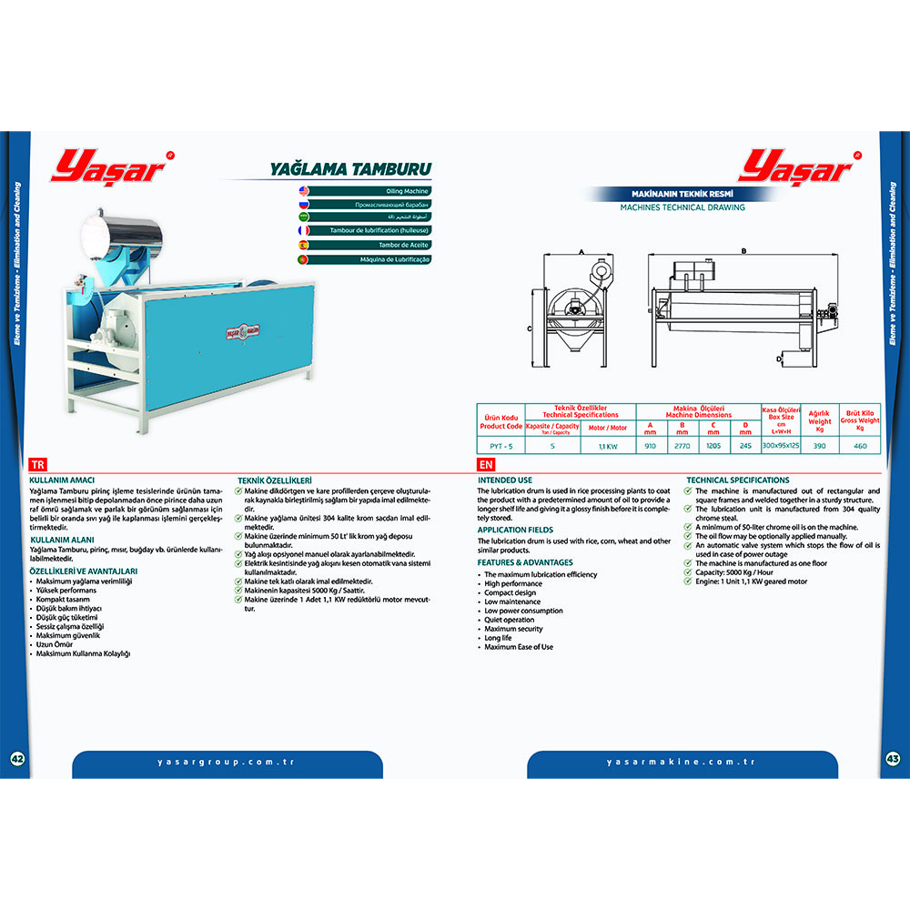 Le tambour huilant est utilisé pour donner au riz transformé un aspect brillant avec une durée de conservation plus longue. Le processus a lieu au cours de l’étape finale du produit à base de riz entièrement transformé. Le tambour est enduit d'une certaine quantité d'huile. Il protège les grains de riz des facteurs environnementaux, de l’humidité et de l’oxydation. Le riz reste frais plus longtemps, la durée de conservation augmente et le produit peut être conservé plus longtemps.