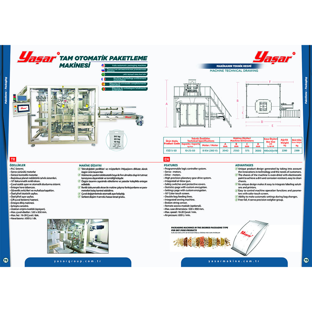 Des conceptions de produits originales, prenant en compte les innovations technologiques et les besoins des clients. Le châssis de la machine est cuit avec de la peinture électrostatique et est résistant à la saleté, à la corrosion et facile à nettoyer. Grâce à sa conception unique, l'étiquetage et les imprimantes peuvent être facilement intégrés. Contrôle facile des fonctions et paramètres de fonctionnement de la machine avec écran tactile couleur. Facilité de réglage automatique lors des changements de sacs. Groupe de balance de précision à chute libre avec 4 servos.