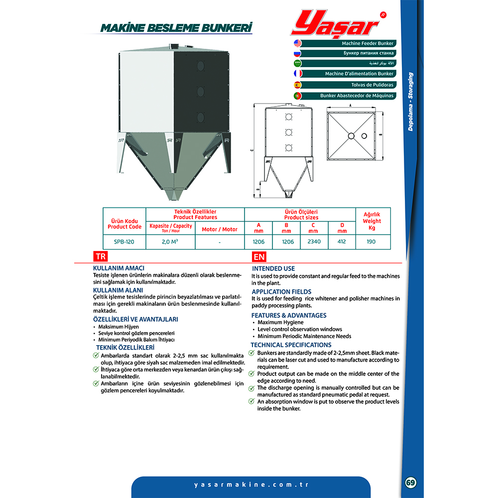 It is used to provide constant and regular feed to the machines in the plant. It is used for feeding rice whitener and polisher machines in paddy processing plants. Maximum Hygiene, Level control observation Windows, Minimum Periodic Maintenance Needs, Bunkers are standardly made of 2-2,5mm sheet. Black materials can be laser cut and used to manufacture according to requirement. Product output can be made on the middle center of the edge according to need. The discharge opening is manually controlled but can be manufactured as standard pneumatic pedal at request. An absorption window is put to observe the product levels inside the bunker. Fully automatic rice mill machines.