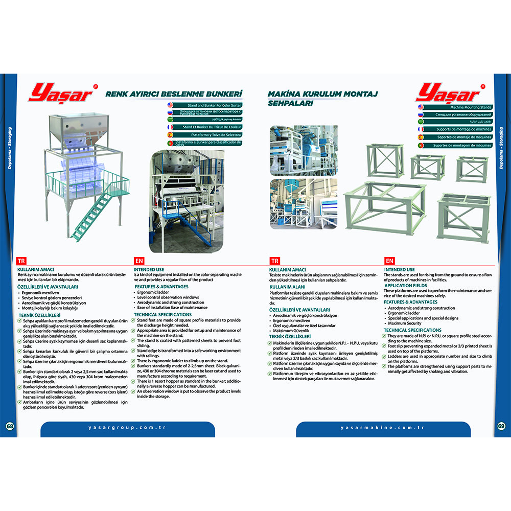 Renk ayırıcı makinanın kurulumu ve düzenli olarak ürün beslemesi için kullanılan bir ekipmandır. Sehpa ayakları kare profil malzemeden gerekli duyulan ürün akış yüksekliği sağlanacak şekilde imal edilmektedir.Sehpa üzerinde makinaya ayar ve bakım yapılmasına uygun genişlikte alan bırakılmaktadır.Sehpa üzerine ayak kaymaması için desenli sac kaplanmaktadır.Sehpa kenarları korkuluk ile güvenli bir çalışma ortamına dönüştürülmüştür.Sehpa üzerine çıkmak için ergonomik merdiveni bulunmaktadır.Bunker için standart olarak 2 veya 2,5 mm sac kullanılmakta olup, ihtiyaca göre siyah, 430 veya 304 krom malzemeden imal edilmektedir.Bunker içinde standart olarak 1 adet resort (yeniden ayrışım) haznesi imal edilmekte olup, isteğe göre reverse (ters işlem) haznesi imal edilebilmektedir.Ambarların içine ürün seviyesinin gözlenebilmesi için gözlem pencereleri koyulmaktadır. Pirinç besleme bunkeri, Renk ayırıcı besleme bunkeri