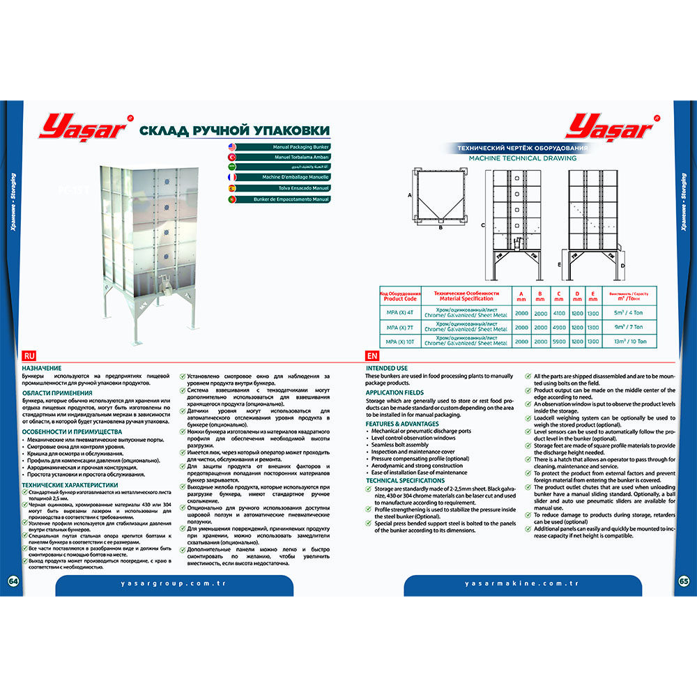 Эти бункеры используются на предприятиях по переработке продуктов питания для ручной упаковки продуктов. Эти бункеры используются на предприятиях по переработке продуктов питания для ручной упаковки продуктов. Хранилища стандартно изготавливаются из листа толщиной 2-2,5 мм. Черные оцинкованные, хромированные материалы 430 или 304 могут быть вырезаны лазером и использованы для производства в соответствии с требованиями. Усиление профиля используется для стабилизации давления внутри стального бункера (опционально). Специальная гнутая под давлением опорная сталь крепится болтами к панелям бункера в соответствии с его размерами. Все детали поставляются в разобранном виде и должны быть установлены с помощью болтов на поле. Системы хранения риса и риса