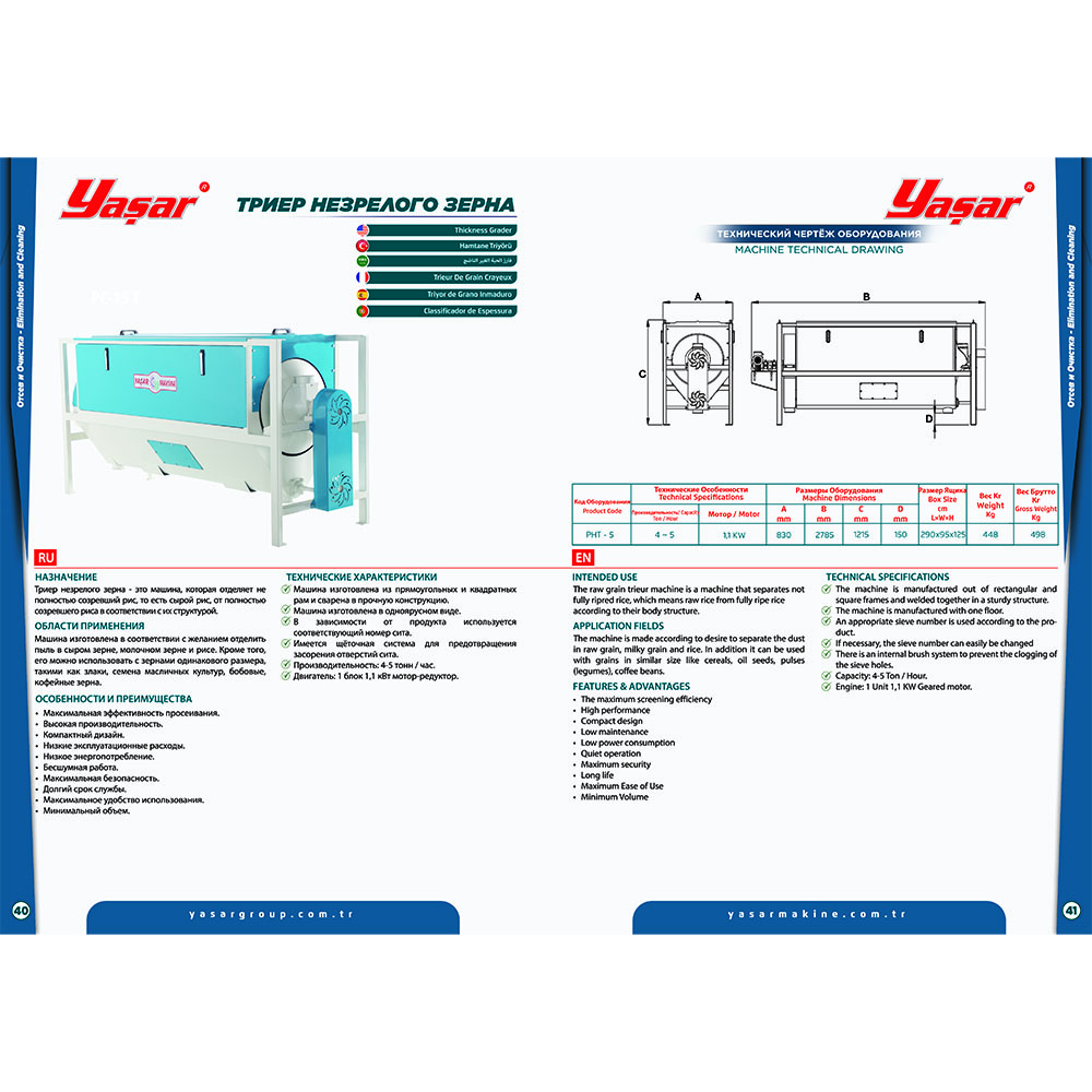 Машина для триера сырого зерна - это машина, которая отделяет не полностью созревший рис, то есть сырой рис от полностью созревшего риса в соответствии со структурой их тела. Машина сделана в соответствии с желанием отделить пыль в сыром зерне, молочном зерне и рисе. Кроме того, ее можно использовать с зернами схожего размера, такими как злаки, масличные семена, бобовые (бобовые), кофейные зерна. Машина изготовлена из прямоугольных и квадратных рам и сварена вместе в прочную конструкцию. Машина изготовлена с одним полом. Соответствующее количество сит используется в соответствии с продуктом. При необходимости количество сит можно легко изменить. Имеется внутренняя система щеток для предотвращения засорения отверстий сита. Производительность: 4-5 тонн / час. Двигатель: 1 блок 1,1 кВт мотор-редуктор. Оборудование для рисовой мельницы