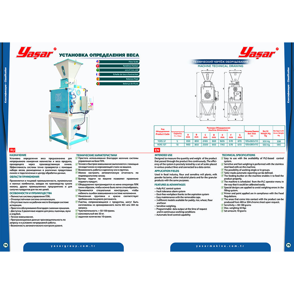 Разработан для измерения количества и веса продукта, который непрерывно проходит через производственную линию. Эффективность системы точно проверяется набором весов, размещенных на различных производственных линиях и подключенных к центру обработки данных. Используется в пищевой промышленности, на мукомольных и манно-крупяных заводах, на заводах по производству сухого молока, на других промышленных предприятиях и для гранулированных продуктов с теми же целями. Прост в использовании благодаря наличию системы управления на основе ПЛК. Чувствительное и быстрое взвешивание выполняется с помощью тензодатчиков из нержавеющей стали на машине. Возможность работы по отдельности или в группах. Можно определить индивидуальные автоматические отчеты. Загрузочный бункер на машине позволяет ей правильно подавать продукт. Весовая машина для риса, весовая машина для риса.