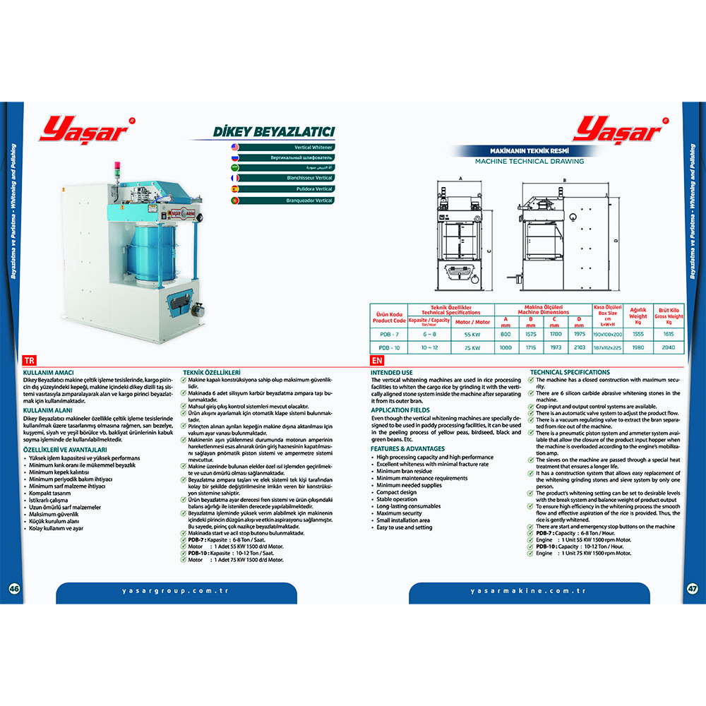 Vertical whitening machine is used to remove the husk or bran on the cargo rice during the process. It is to clean this bran on the outer surface of the rice by sanding it with the help of a vertically arranged stone system inside the machine. The machine removes the husk and foreign materials on the rice grains with the help of vertical stones. The outer surface of the cargo rice becomes white and gains a more attractive appearance.