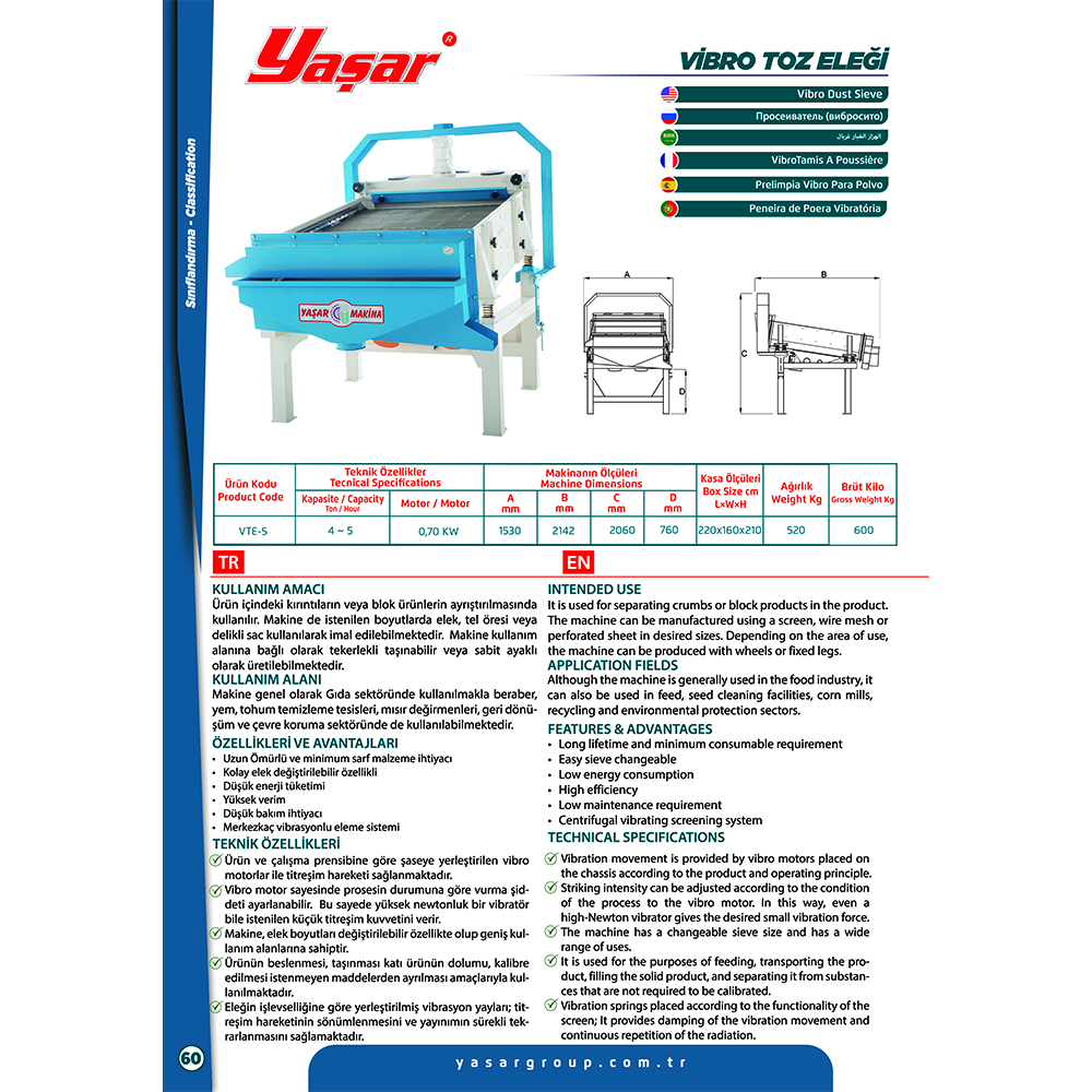 Vibro Dust Screen is used to separate the crumbs or large block pieces in the products. It is carried out using specially designed screen, wire mesh or perforated sheet. Materials can be produced in the desired dimensions and in accordance with the requirements. The machine can be produced with portable wheels or mounted with fixed feet depending on the area of use. This variety allows users to easily adapt the machines for different processes and increases work efficiency.